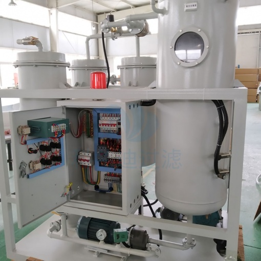 目前用于200MW機組的國產油凈化裝置主要是利用沉降和過濾原理,其基本結構由沉積箱、過濾箱和貯油箱構成。在沉積箱中設有多層分離網,依靠油和水的重力差,油中的水在穿過分離網時凝聚成水滴,沉降在箱體下部,由自動抽水器排出箱體外。這些凈油設備設計容量較大,體積尺寸也較大,而且從使用情況看,普遍存在著除水效果差、油臟、易堵塞凈化裝置等現象。另外也有采用普通真空式凈化裝置,利用閃蒸原理除水并用網狀過濾器除雜質,這類裝置宜于脫除油中的微量水分,但對于漏水嚴重的機組,尤其是乳化的油液往往無能為力,也不宜于連續(xù)投入運行。若使用TY型汽輪機透平油專用濾油機,不但可以有效去除油中的空氣、水及雜質,而且能夠自動破乳化。從而實現對發(fā)電汽輪機機組的透平油凈化的目的。